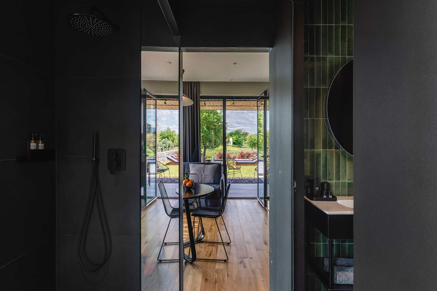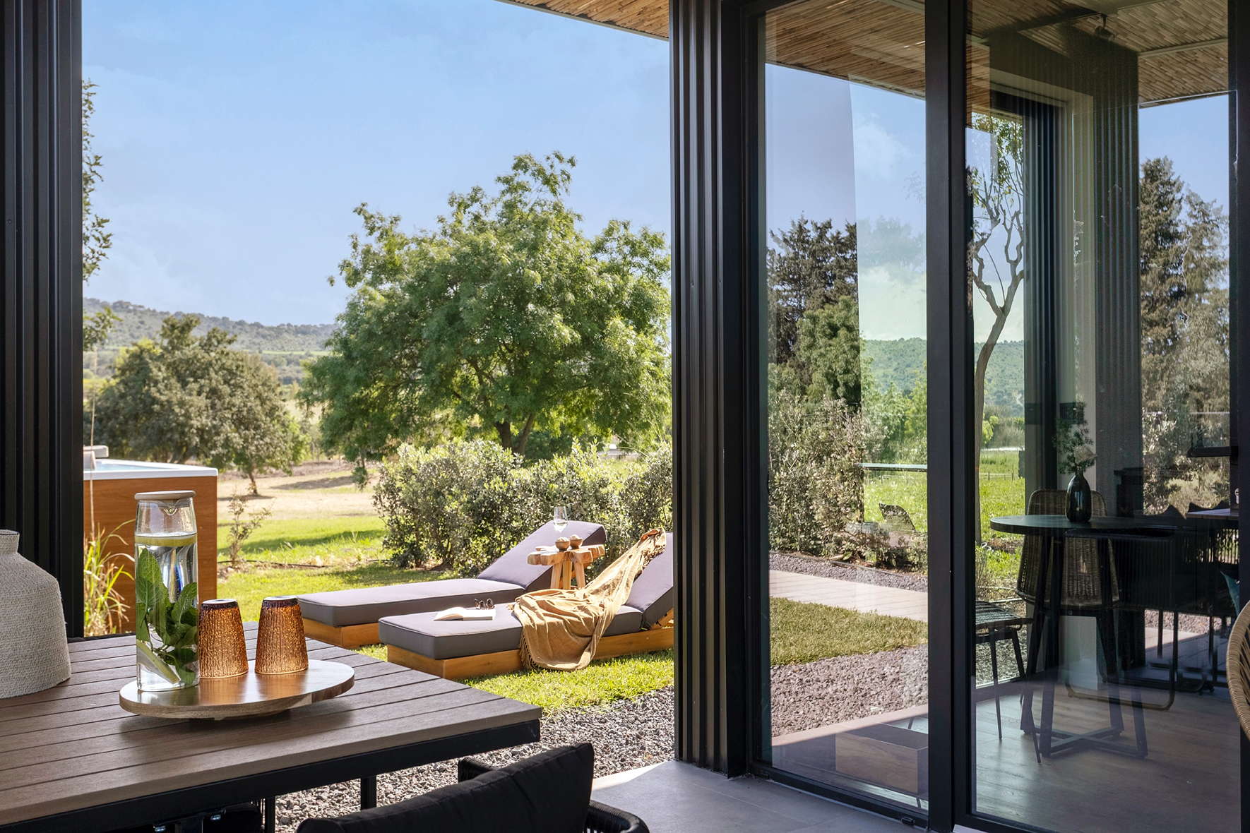 The private garden includes a furnished veranda, solarium, a 30 sqm infinity swimming pool and a heated hot tub, perfect for relaxing in nature (both available year-round)