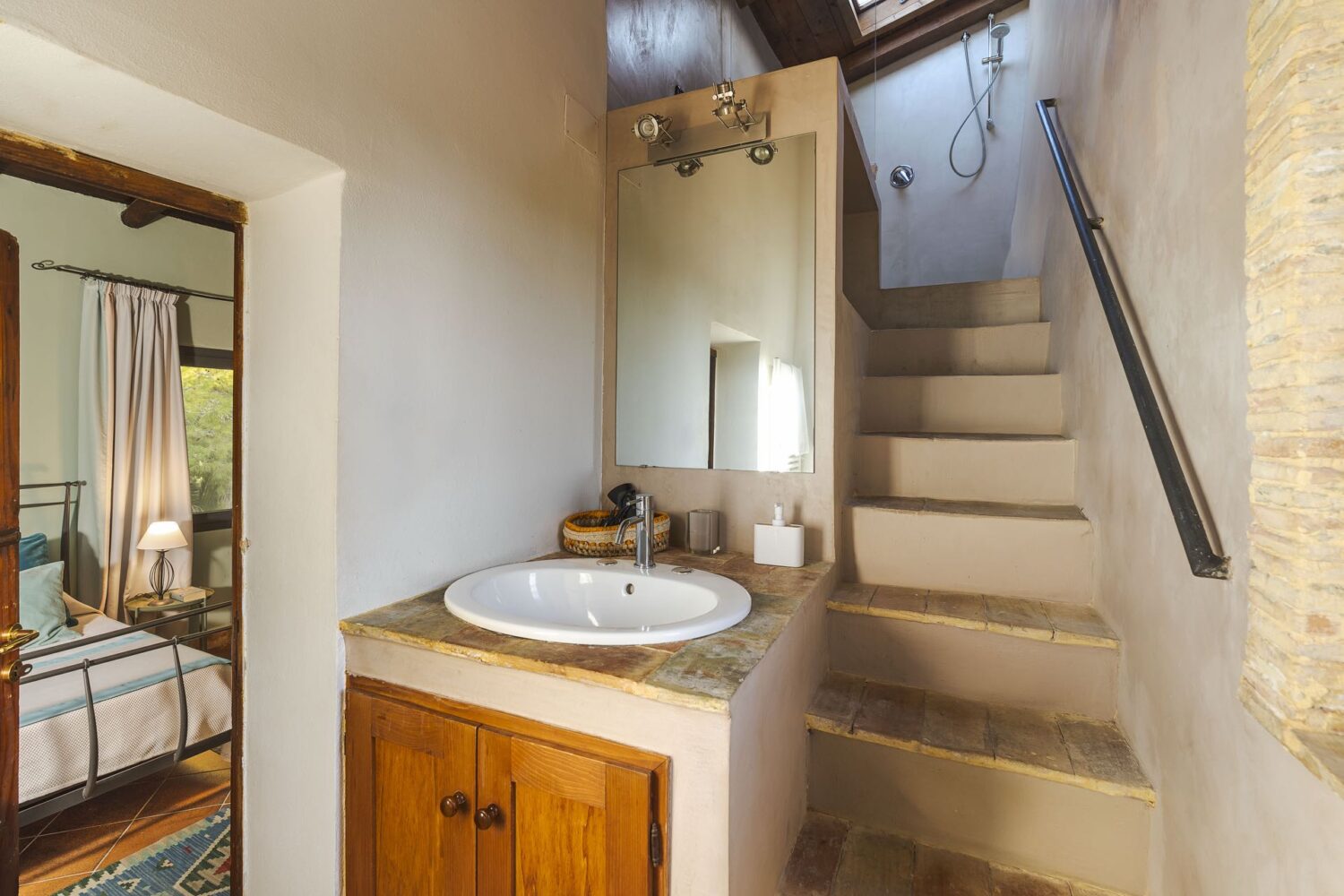 The villa spans two floors, combining original stone architecture with modern comfort. On the ground floor, a large living room with six-metre ceilings features sofas and an old fireplace. Next to it, a bright dining room and a fully equipped kitchen open directly to the garden.