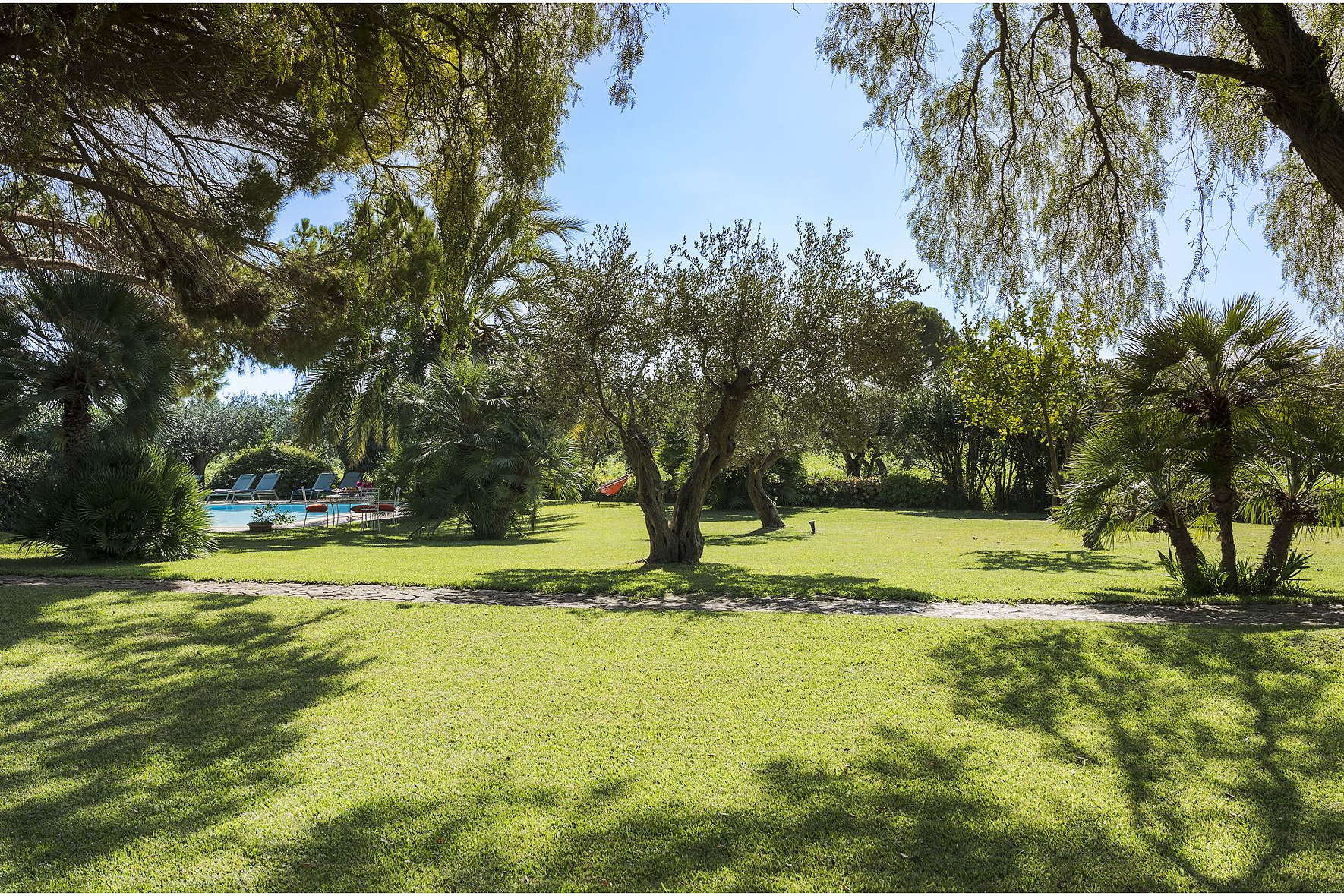 Villa Selvira sits within a peaceful organic estate framed by olive and citrus groves. A private driveway leads to shaded terraces and a large dining patio with barbecue and pizza oven. A short path opens onto a wide lawn and a 12×6 m swimming pool surrounded by palms and flowering shrubs.